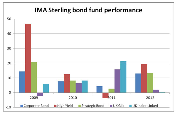 The prolonged squeeze on interest rates helped 2012 to be another good year if you held corporate bond fixed-interest funds, although government bond funds were virtually flat. The performance for the main Investment Management Association (IMA) Sterling bond fund sectors is shown in the graph.